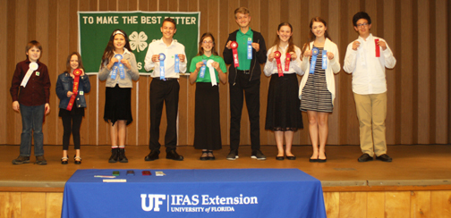 SAINT AUGUSTINE – The St. Johns County 4-H Youth Development program held its annual 4-H Public Speaking contest Jan. 30 at the St. Johns County Agricultural Center. Youth from all age divisions, Cloverbuds (ages 5-7), Juniors (8-10), Intermediates (11-13) and Seniors (14-18), competed in this showcase event. 4-H supporters served as judges for the night, including four 4-H alumni. The alumni included Judge Clyde Wolfe, Sister Susan Foster, Ms. Mickey Mickler and Dr. Danita Heagy. Horticulture Extension Agent Terra Freeman and the parent of two 4-H alumni, Kym McWilliams, volunteered their time and shared their expertise with the young competitors as well. Senior 4-H’ers Javier Bermeo and Miguel Bermeo served as emcees for the event.