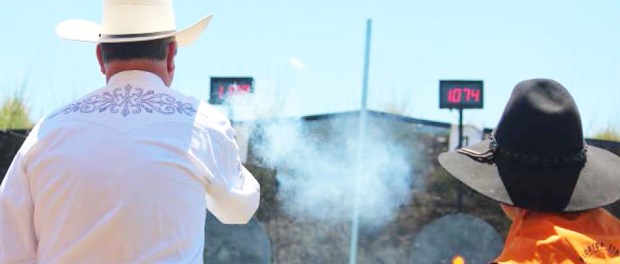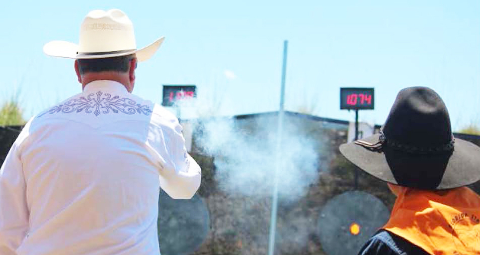 The shootout is a timed event using single action revolvers with wax bullets, shooting at metal targets. Competitors use western-style cowboy gun belts and holsters.