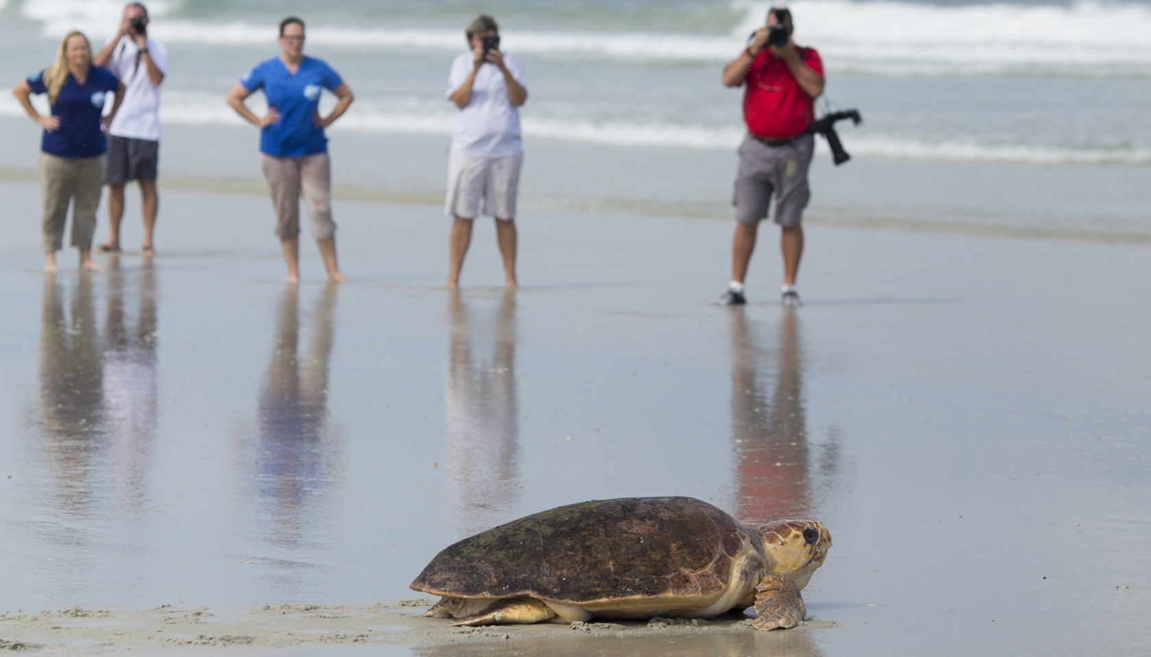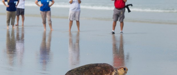 Bystanders watch a rescued and rehabilitated sea turtle make it's way back to sea during a public release. Photo taken 09-28-16.