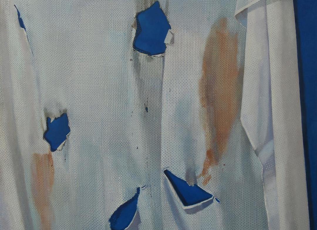 The artist’s recent series of smaller works on panel and large-scale paintings on canvas push the boundary between abstraction and representation. Each painting holds the trace of an action Raedeke has taken on fabrics which she has layered together, such as making tears and then re-stitching areas back together, marking the fabric with brush strokes or pencil marks, leaving drips and smudges, or strips of duct tape and burnt holes. In “Play Along” (2018), the artist has draped white nylon mesh fabric over a cobalt blue backdrop, into which she has torn or burnt holes, or added marks of color. From afar, the blue shapes created by the torn areas pop out of the white background. Upon close inspection, the fabric’s subtle details become recognizable, and one can get lost in the play of light and shadow upon the tiny holes inherent to the fabric, which the artist has painstakingly recreated.