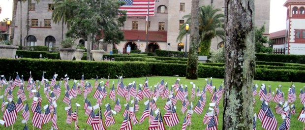 SAINT AUGUSTINE – Hundreds of flags have been placed in front of the Lightner Museum/City of St. Augustine building this Memorial Day. Each flag carries the name of an individual who served in the U.S. Armed Forces – both living and deceased individuals.