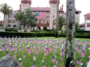 SAINT AUGUSTINE – Hundreds of flags have been placed in front of the Lightner Museum/City of St. Augustine building this Memorial Day. Each flag carries the name of an