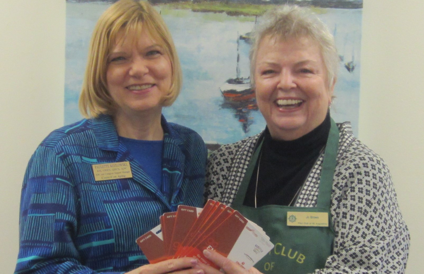 SAINT AUGUSTINE – Jo Brown, president of the Pilot Club of St. Augustine, visited the Council on Aging Feb. 26 to present gift cards to those who are serving as caregivers for Alzheimer patients. This is part of the club’s Pick Me Up program recognizing individuals who are dealing with various bumps in their lives. Jo, right, is pictured with Paulette Kozlowski, adult day care and caregiver support manager at the COA.