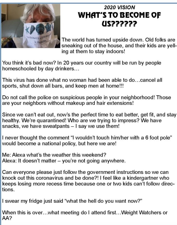 Styling with the new normal Posted on April 17, 2020 by PluggedInto in Healthy lifestyle, St. Johns // 0 Comments St. Augustine Beach resident Lorraine Thompson has adjusted to the new normal with this beach-themed mask which lifts spirits in a time of frustration and fear. Share this: Click to email a link to a friend (Opens in new window) Email TweetLike Loading...